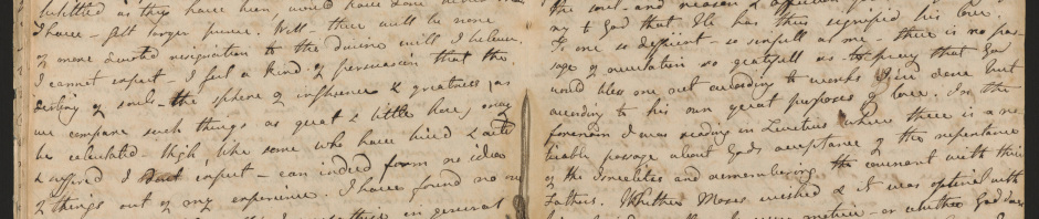 What darkness do the Scepticks throw on the subject of mind. How blessed the light of the gospel–It is bet-ter to depart & be with Christ But if this power of life assumes other organisation, and by degrees in <other> degrees acquires or recovers the past powers–yet it will be under the govt and care & designs of God. But tho’ our state in that high place, where Jesus has gone to prepare mansions, may well resemble our infancy in this, yet that the loss of any visible organs shall reduce the immortal immaterial part to to darkness & ignorance is not rational, philosophical & scriptural. Rather all concur to say that the celestial body will exist a vehicle for tho’t and all the powers of mind.–“a substance immaterial in which they adhere.” immortal–invisible matter if I may so say. Then why the resurrection? Perhaps that doc-trine was among the allegories. Perhaps–some powers of the human mind may depend on the organization of some part of the buried body–and the resurrection be necessary to complete the mature man.